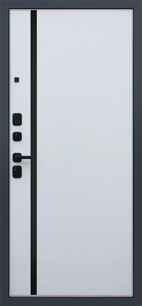 Порошковое покрытие "муар черный". Экошпонированная панель МДФ 10 мм (дизайн ФЛС). Цвет "черный кварц". Вертикальная вставка из черного глянцевого лакобеля. Объемная фрезеровка. Наличник МДФ гладкий, 80 мм.