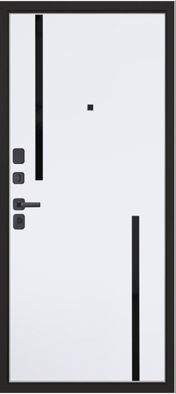 Порошковое покрытие "муар черный". Панель МДФ 10 мм (цвет "черная шагрень"). Объемная фрезеровка. Вертикальные вставки из пластика 3 шт (цвет "черный"). Наличник МДФ 80 мм.